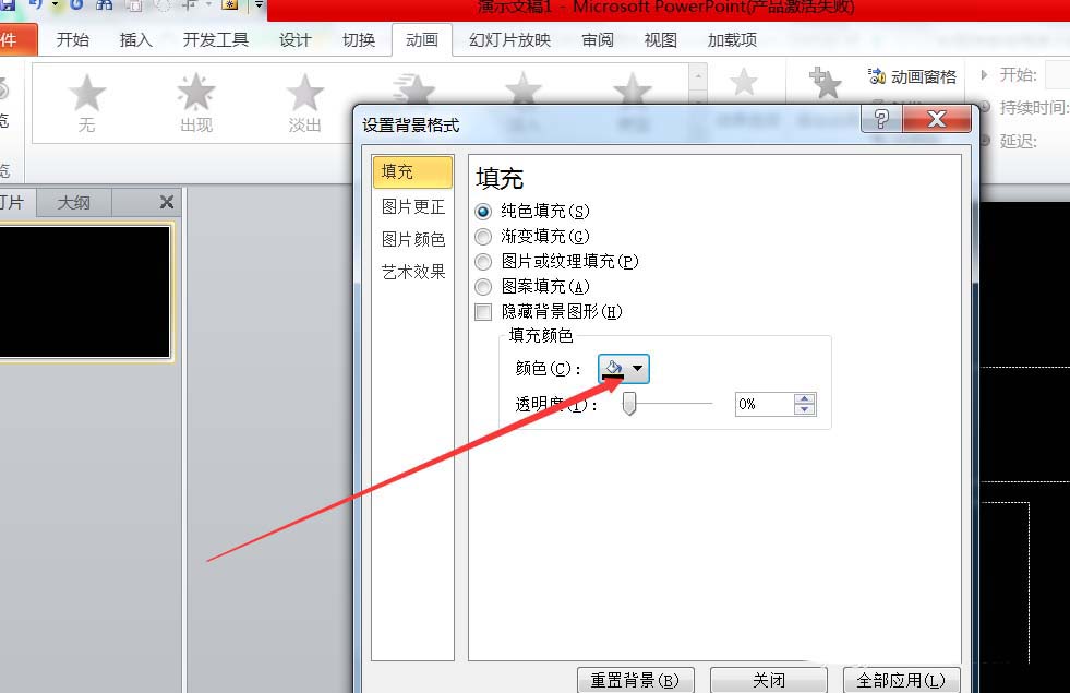 1、打开PPT,新建一个新的幻灯片,右击幻灯片空白的地方,然后设置幻灯片的背景为黑色。
