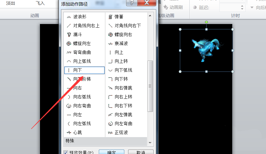 3、菜单栏切换到“动画”的界面,然后选中这张图片,设置路径动画的“向下”。设置完之后,将向下的路径拖拉成斜向下。