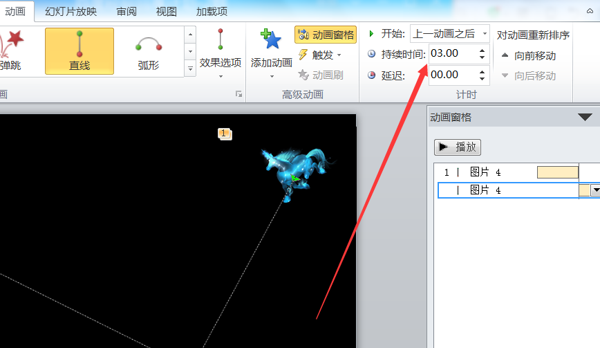 6、在右边动画窗格中,将两种动画的时间延长,然后第二个动画的开始时间设置成“上一个动画之后”。这样,奔跑的骏马就完成了。