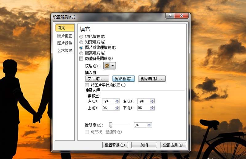 2、选择图片执行ctrl+x进行剪切操作,右键单击选择设置背景格式命令,设置为图片或纹理填充,并点击剪贴板。