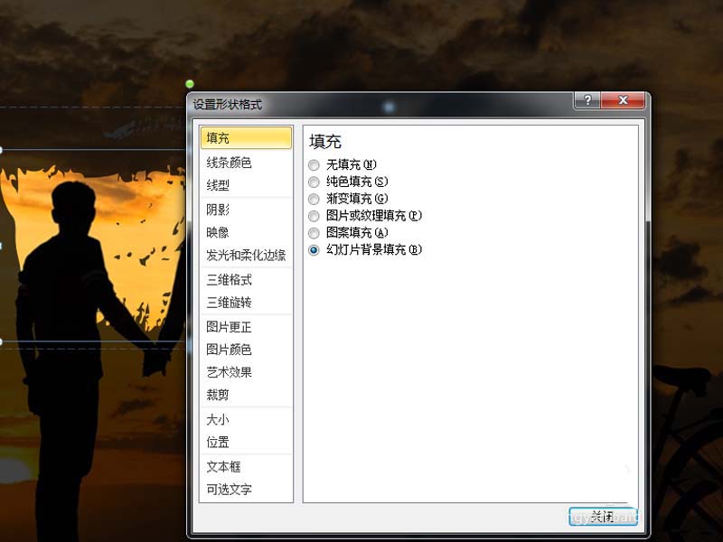5、调整墨迹的大小和位置,调出设置形状格式对话框,勾选幻灯片背景填充。