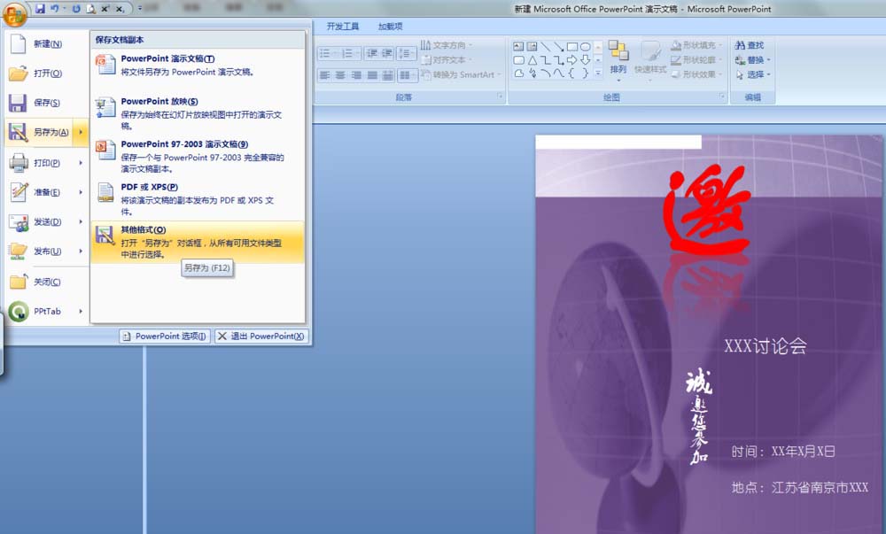 1、单机左上角office按钮,然后依次选择另存为→其他格式。
