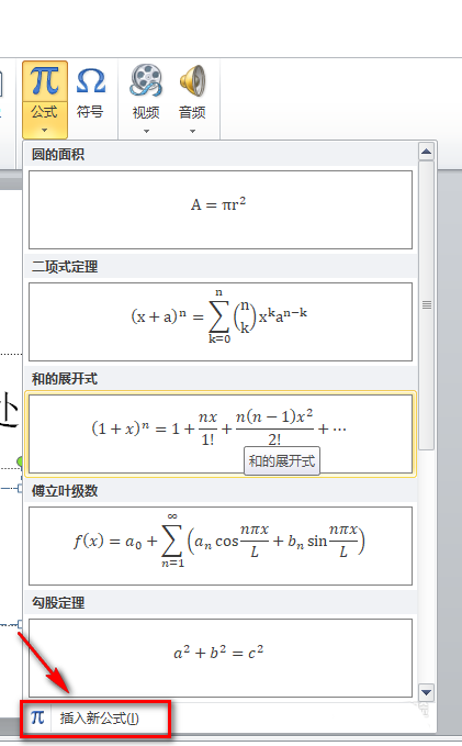 3、我们可以看到有圆的面积、二项式定理、和的展开式、傅里叶级数等等常用的公式。如果没有找到你常用的公式,可以点击最下面的插入新公式。