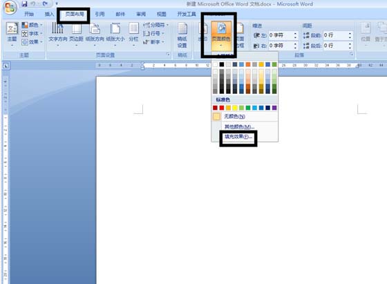 1、点击打开WORD的软件,在WORD软件的首页我们点击上方主菜单栏里的【页面布局】按钮,然后选择下方子菜单栏里的【页面颜色】,在弹出下拉菜单里我们点击下方【填充效果】