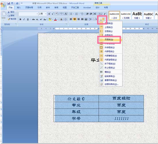 6、完成以上步骤后,论文的封面内容就基本完成了,此时我们点击编辑页面里的表格,此时上方菜单栏里会出现表格工具,我们在表格工具里点击表格边框图标,将表格的图框设置为无边框即可完成封面的制作。