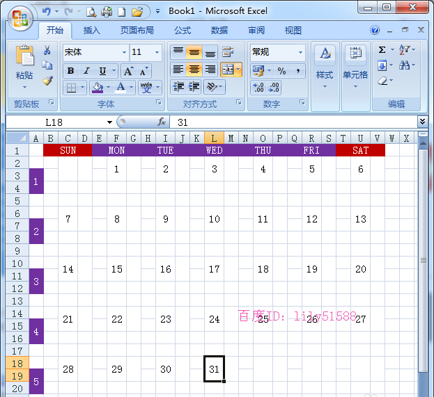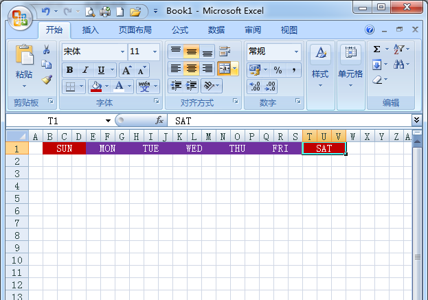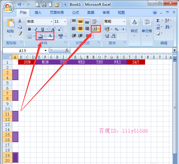 2、把B1到D1的3个单元格选中合并为1个,然后向右拖动鼠标将其它的6组单元格合并。输入星期的英文字母,将周末填充为红色,周一到周五填充为紫色,字体为白色。