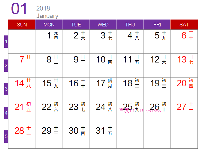 8、在表格的上面再插入三行单元格,输入01从1月份开始制作,在右边输入年份和月份的英文字母即可。一张1月份的日历做好了,用同样的方式来制作其它月份的日历即可。
