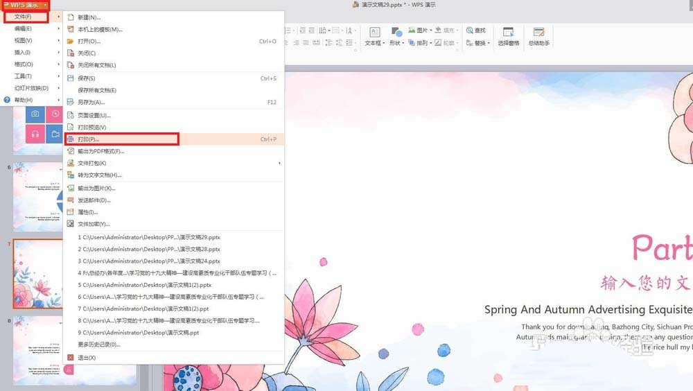 1、首先在电脑上找到需要打印的PPT,双击打开,在页面左侧上方找到“WPS演示”旁边的倒三角形符号,点击打开,找到“文件”,点击一下,在出现的信息中点击“打印”。