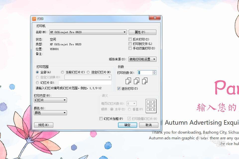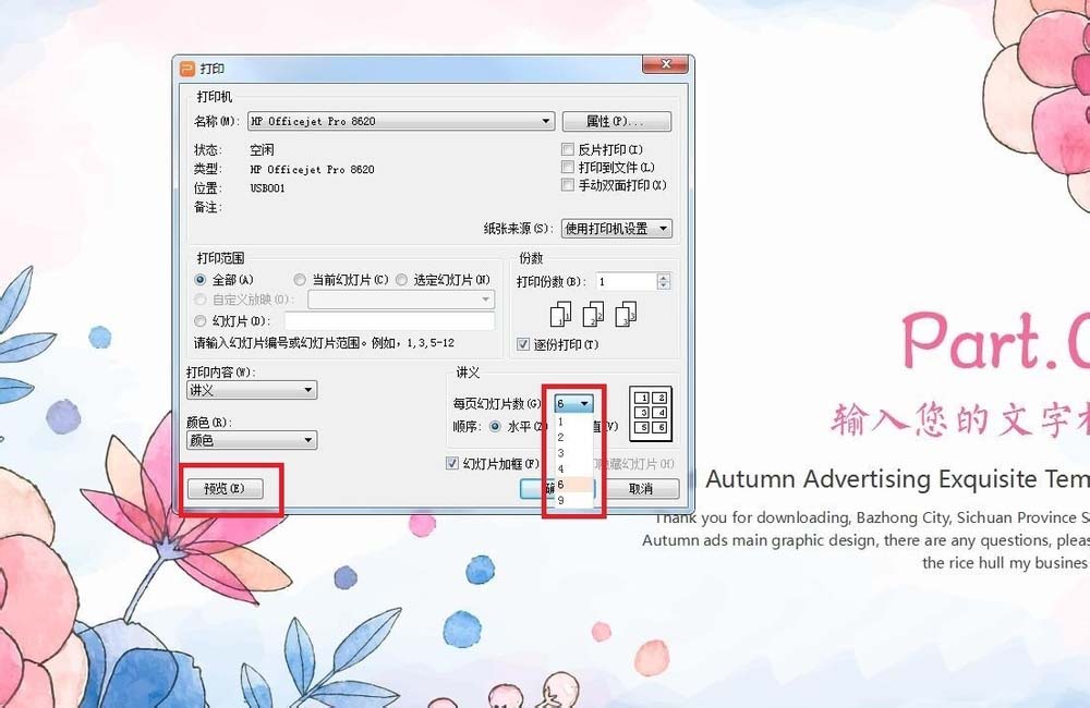 4、后找到“每页幻灯片数”,点击选择数量,有“1.2.3.4.6.9”,根据需要选择就可以啦,选择好后点击左侧下方的“预览”。