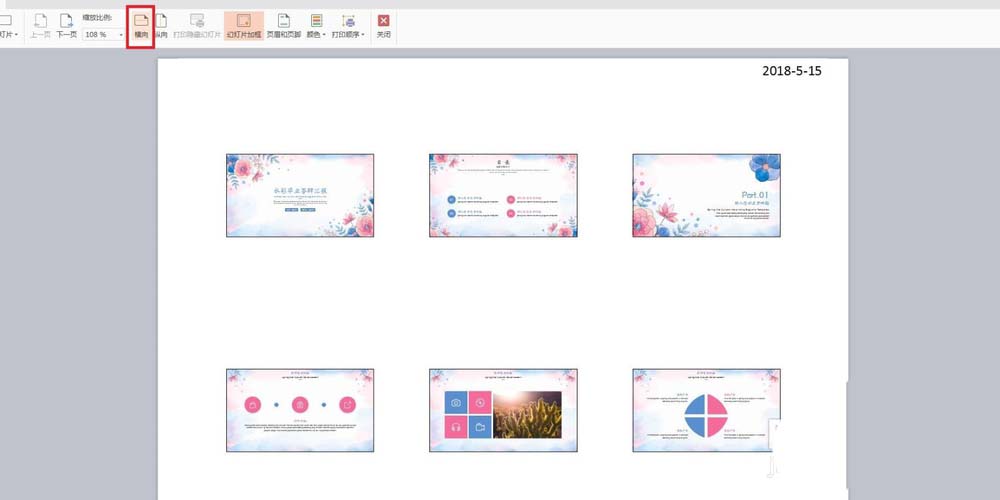 5、在预览中,可以看到一页里面有6张幻灯片,这里默认的预览是“纵向预览”,还可以在上方点击一下“横向”,此时可以看到横向打印预览,预览完成后可以点击上方的“关闭”。
