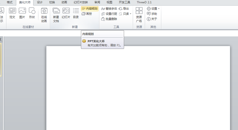 1、首先启动ppt2010,执行美化大师菜单,从中选择内容规划选项。