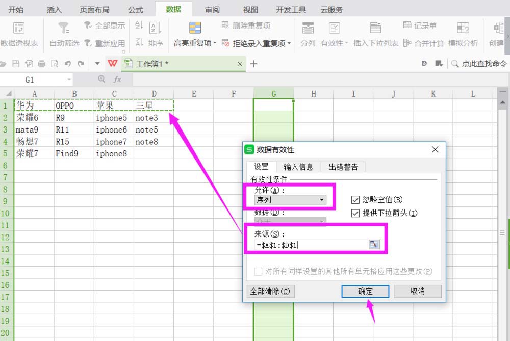 6、同样将允许的条件设置为序列,来源设置为 =INDIRECT(G1) ,点击确定,这里的G1就是一级下拉列表的单元格