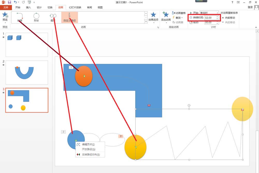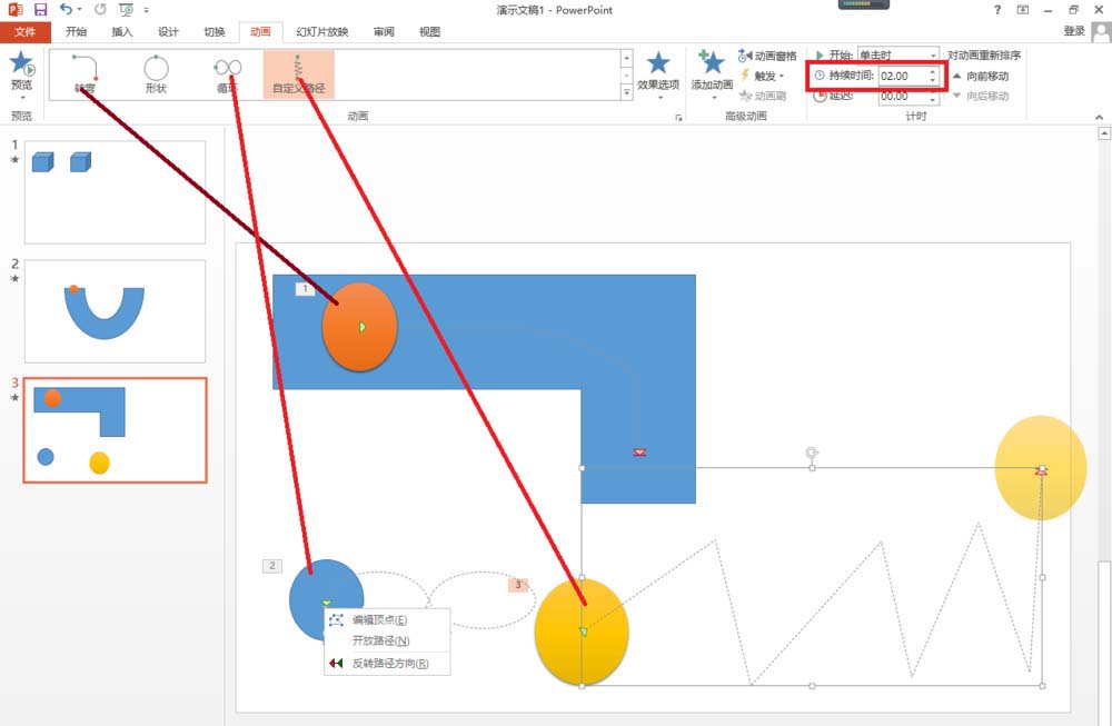 按照路径动画制作的方法可以制作转弯运动、循环运动以及自定义路径(按照自己画的路径运动),如下图。如果想要运动补间运动时间长一些,可以在持续时间那里进行设置。右击动作路径还可以编辑顶点,并且可以设置开放路径和反转路径方向运动。