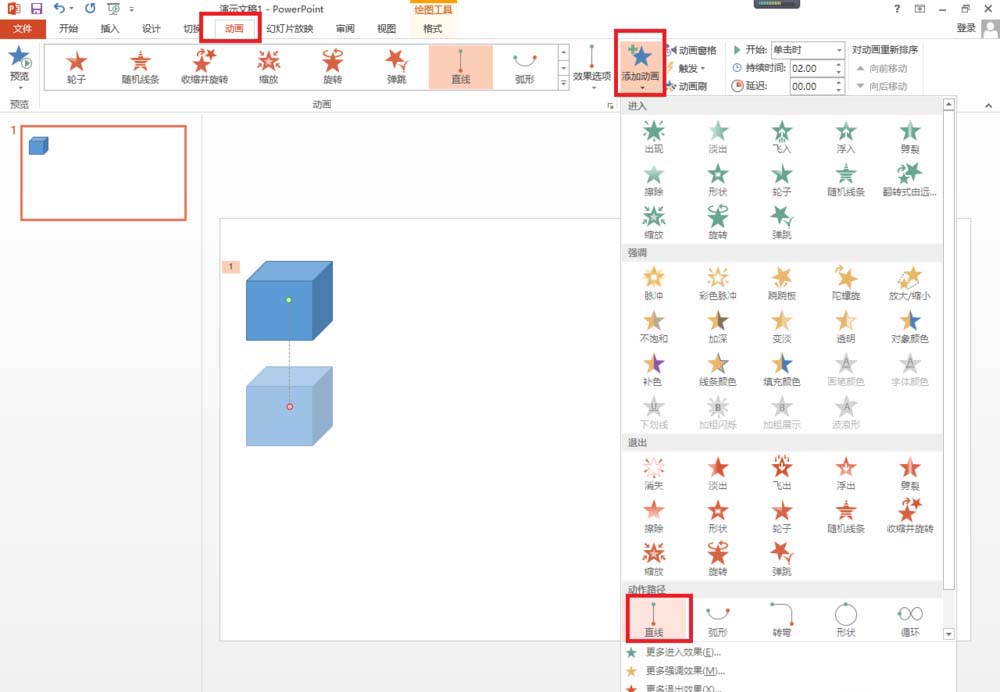 1、选中要制作动画的图形——点击动画——添加动画——动作路径——直线。点击一下该图形,这时马上出现垂直往下运动路径。可以按住粉色小圆点往下或往上移动,制作垂直运动路径的长短。