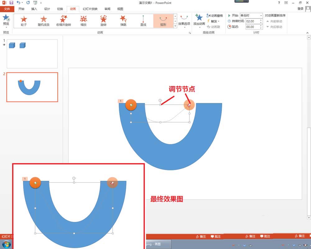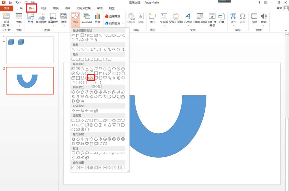 比如我要制作一个小圆从弧的一端运动到另一端。首先点击插入——形状——空心弧。然后再插入一个小圆,把小圆放在弧的一端——选中小圆——点击动画——选择弧形——调节好弧形路径的节点,使得小圆能沿着弧形路径运动。