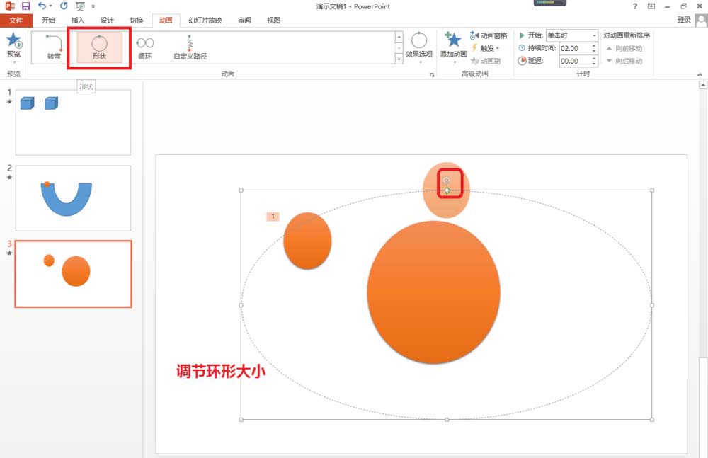 按照上一步骤插入一个大圆和小圆,效果是小圆围绕大圆做圆周运动——选择小圆——动作路径选择形状——调整环形的大小。如果想要一周运动后回到原位,可以按住绿色箭头拖动,使得开始与结束的小圆重合。