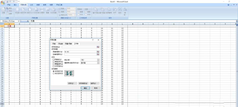 5、页面布局--打印标题--顶端标题行,输入行号,点击确定。