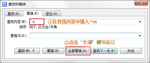 ①使用快捷键Ctrl+H打开替换对话框,输入^m;