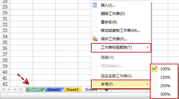 答:工作表的名称支持设置字号大小和便签颜色更改,不支持更换字体的操作。设置字号大小和便签颜色更改的操作是,将鼠标光标移动到工作表标签上,单击鼠标右键选择”字号“可以更改字号大小,选择”工作表标签颜色“可以进行颜色更改设置。