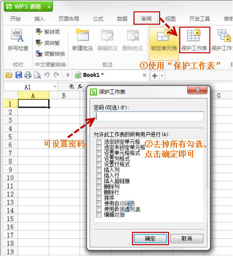 答:使用”保护工作表“的功能即可,步骤,点击菜单栏”审阅“→”保护工作表“,取消所有打钩的项后点击”确定“即可,如下图: