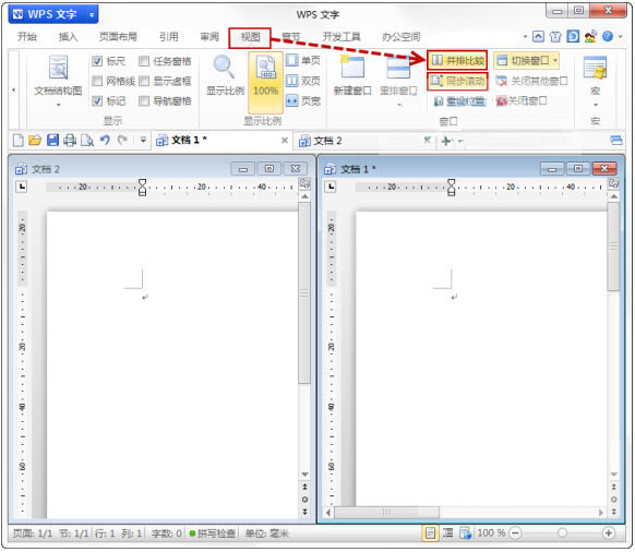 答:打开需要进行比较的两个文档后,点击菜单栏”视图“→”并排比较“就可以了,也可以选择是否进行”同步滚动“,如下图: