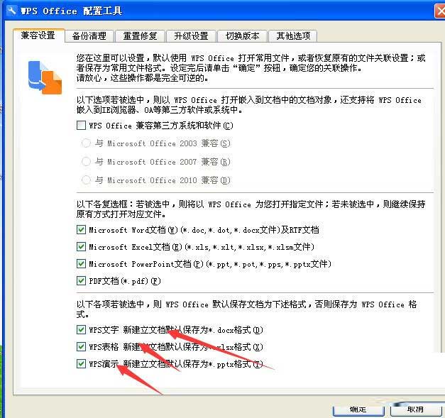 6、选择兼容设置,把箭头所指的前面的勾取消掉,重新打开wps软件,就会变快了;