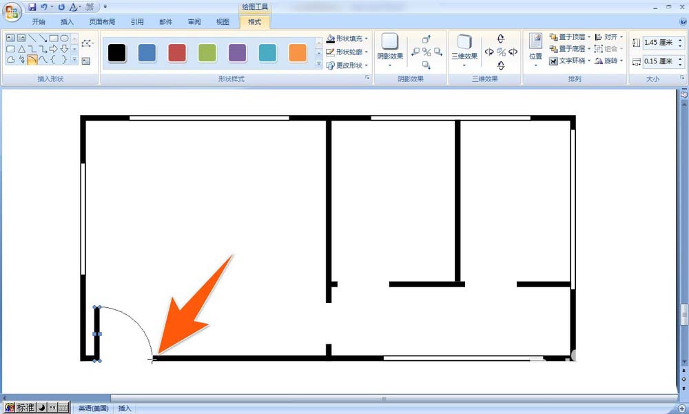 3、门体在合适的位置画好后,可直接在绘图工具的格式下面,点击左上角的那个弧形。