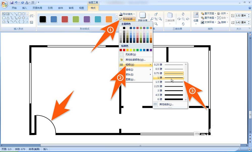 5、如果需要改动这条弧线的粗细,那么可点击上方的形状轮廓,再点击粗细,然后就可以自行选定需要线条大小了,如下图箭头1、2、3所指。