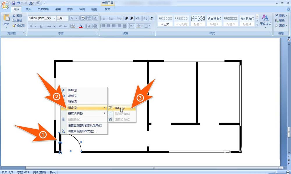 6、当一条门画出来后,为了更快速的把其它门体也标示出来,可以按住Ctrl键,再依次点击门体和弧线,把这两者都选中后,再在上面右击鼠标,然后点击组合—组合,如下图所示。