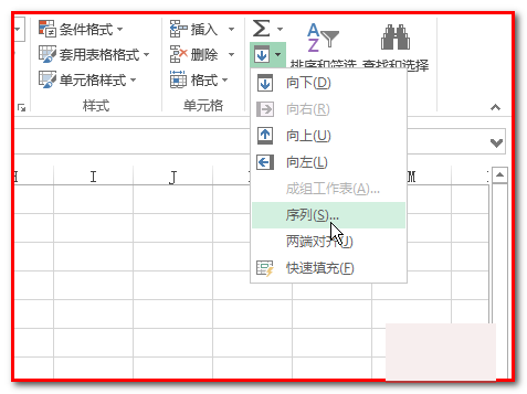 2、再点开始选项卡的填充命令,弹出菜单点:序列