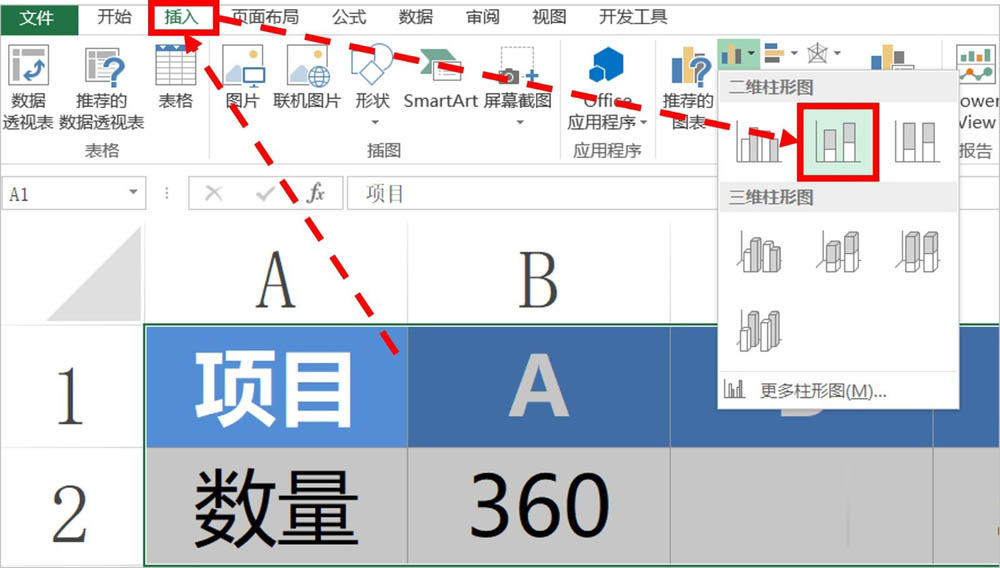 1、按Ctrl+A全选表格,点击"插入"菜单下的"堆积柱形图"插入图表。