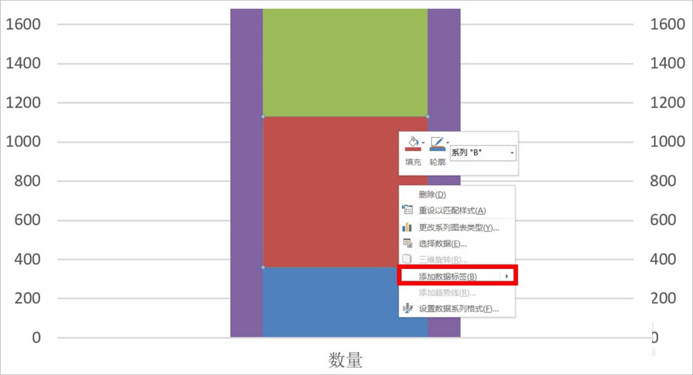 7、然后,为堆积的柱形添加数据标签(选中柱形>鼠标右键单击>点击"添加数据标签",下图1),下图2是效果图。