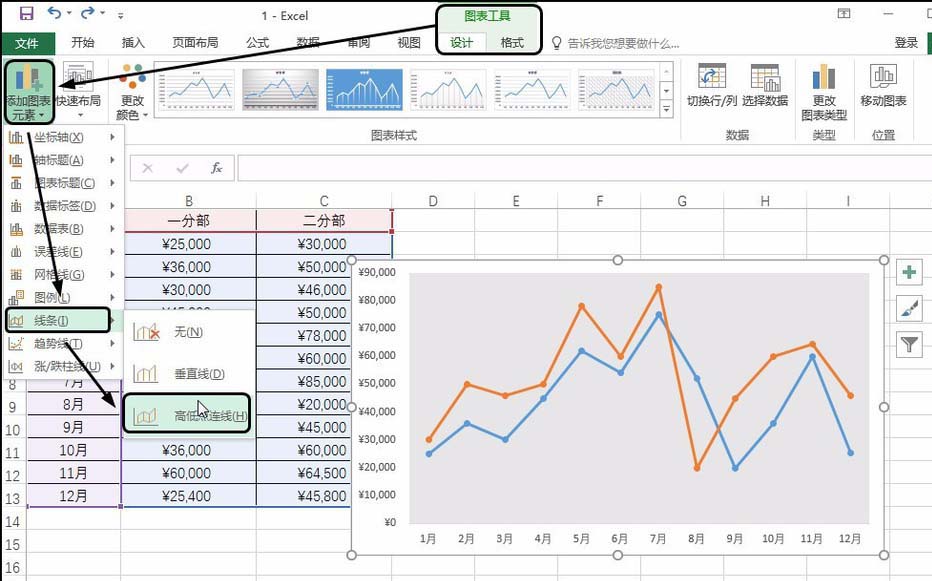 选中图表,单击“图表工具-设计”选项卡,单击“添加图表元素”按钮,在展开的列表中单击“线条”,在级联列表中单击“高低点连线”选项,如下图所示。