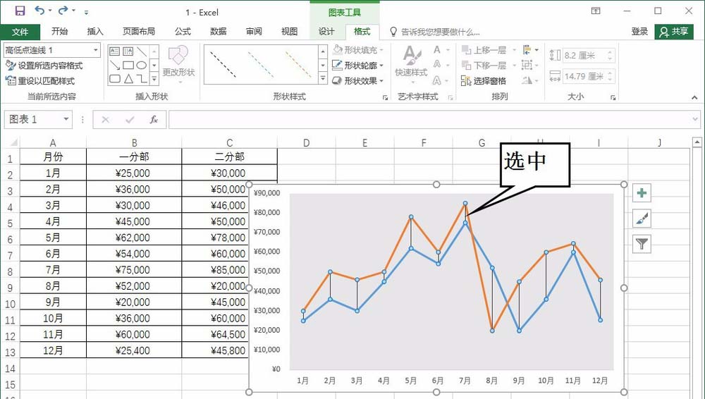 即可看到两条折线图之间使用了线条进行了连接,在图表中单击高低点连线,选中该线条,如下图所示。