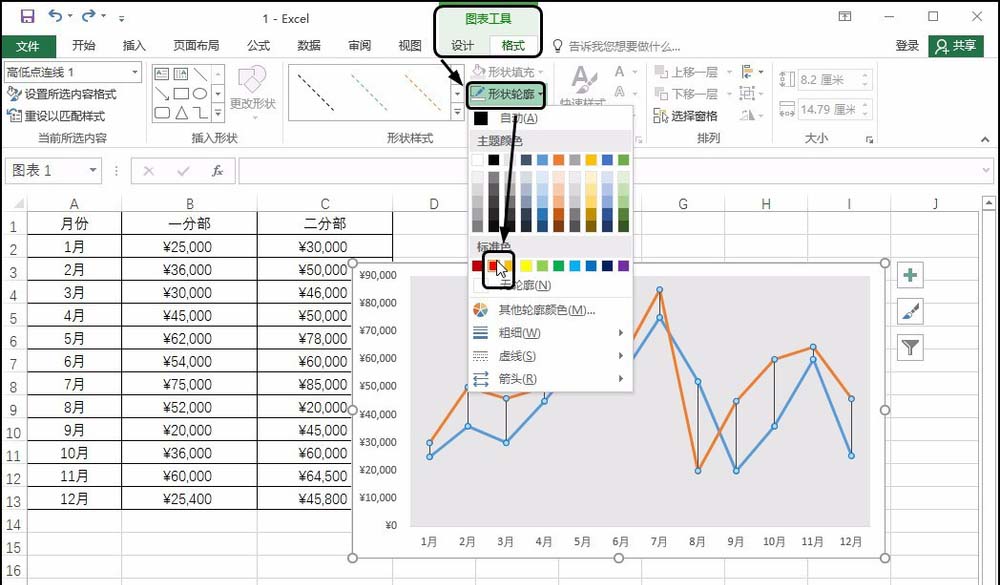 选中图表,单击“图表工具-格式”选项卡,单击“形状轮廓”按钮,在展开的列表中单击要设置的颜色,如红色,如下图所示。