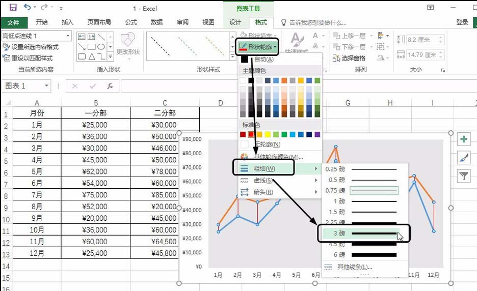 单击“图表工具-格式”选项卡,单击“形状轮廓”按钮,在展开的列表中单击“粗细”,在级联列表中单击磅数,如“3磅”,如下图所示。