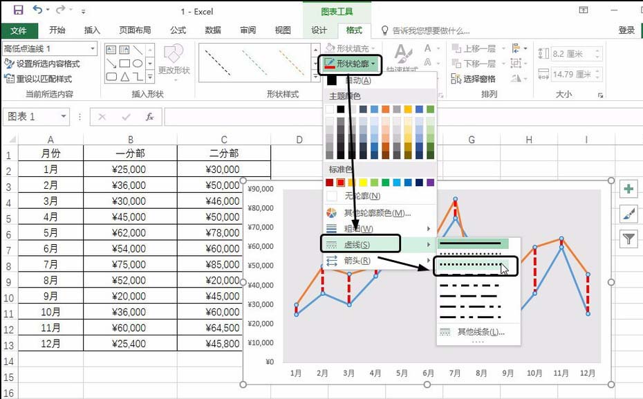 单击“图表工具-格式”选项卡,单击“形状轮廓”按钮,在展开的列表中单击“虚线”,在级联列表中单击要应用的虚线样式,如下图所示。