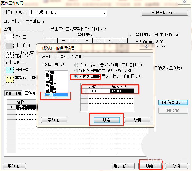 6、然后在选择日期“星期六”,重复设置第五步中的操作,设置完成后点击“确定”按钮,完成对工作时间的更改。