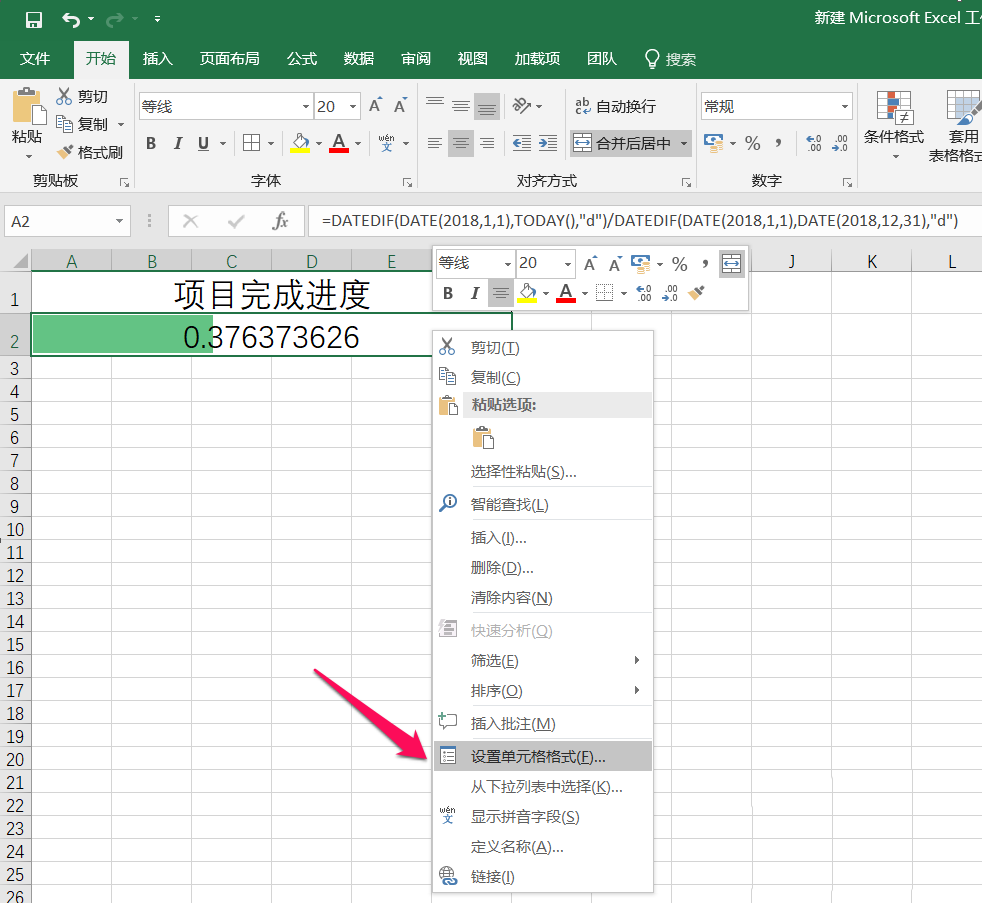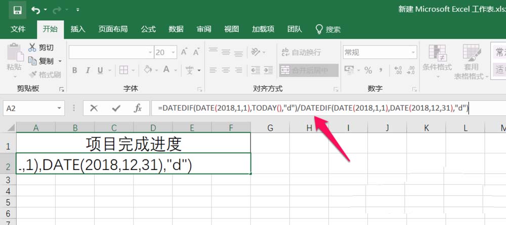 2、然后在单元格中输入公式 =DATEDIF(DATE(2018,1,1),TODAY(),"d")/DATEDIF(DATE(2018,1,1),DATE(2018,12,31),"d"),其中DATEDIF函数为计算两个日期之间的差值,DATE为日期函数,TODAY函数为今天的日期,这里是计算今天到20180101的日子占全年的百分比,如下图: