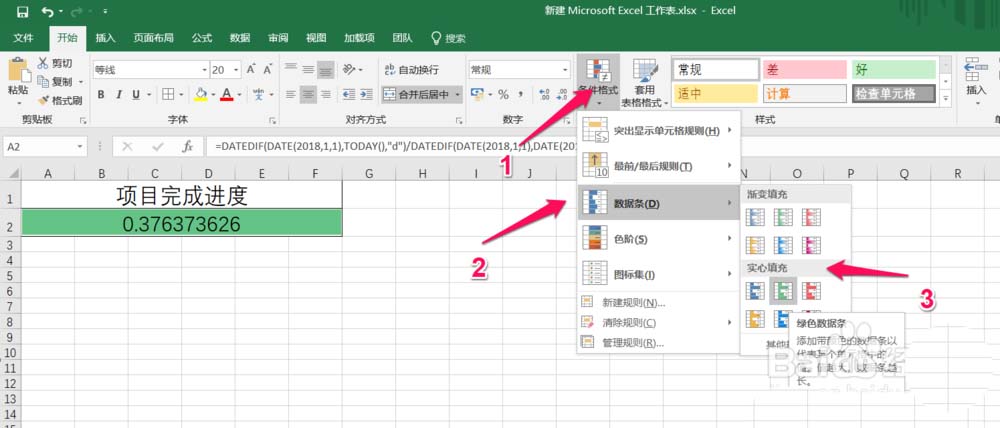 4、然后选中进度的单元格,然后按照下图中红色箭头指示位置依次点击 条件格式->数据条->实心填充 中的任何一种颜色即可,这里小编选择绿色,如下图:
