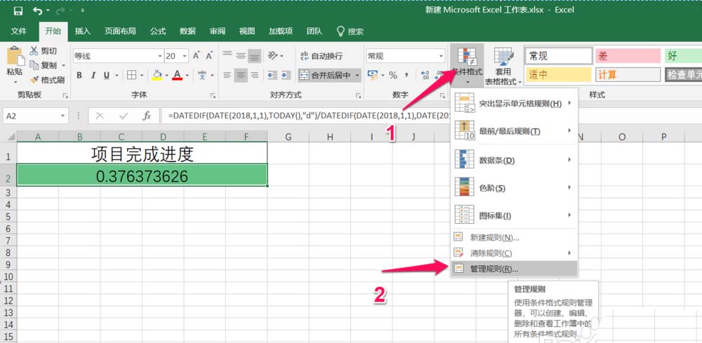 6、继续按照下图中红色箭头指示位置点击 条件格式->管理规则,如下图: