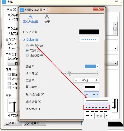 1、这里我们需要把wps文字中的字设置为用虚点组成的字。