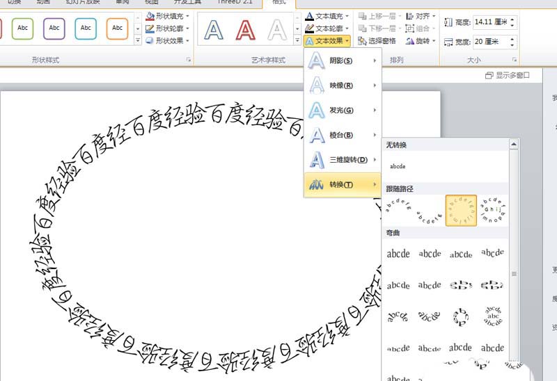3、文字内容复制若干,执行格式-文本效果-转换命令,选择跟随效果里的圆形。