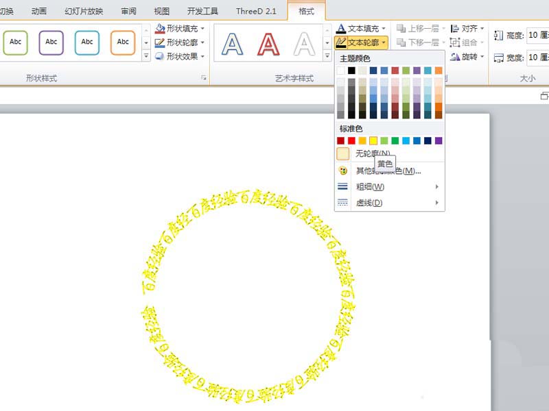 5、接着选择文本内容,执行格式菜单,设置文本框轮廓为黄色,查看效果。