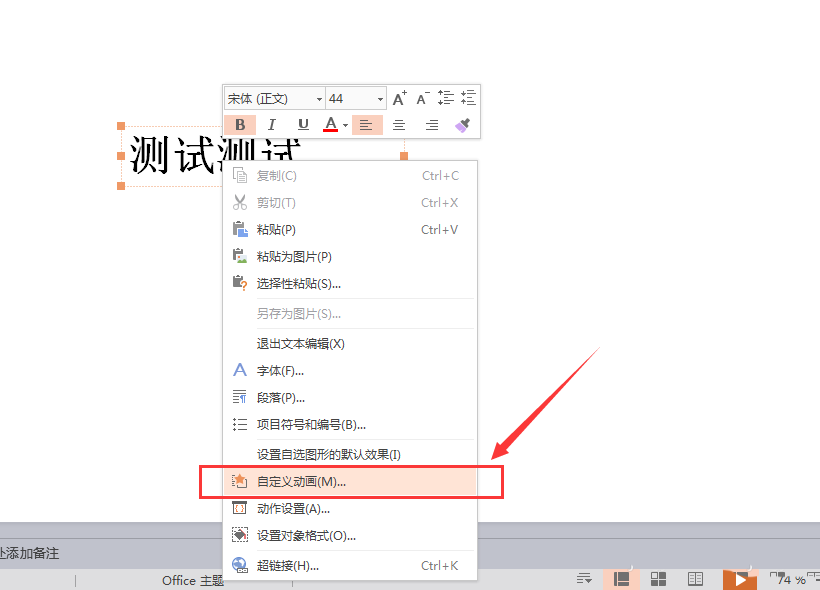 3、我们对文本框进行选中,并且使用鼠标右键单击,在下拉选项中,选择(自定义动画)