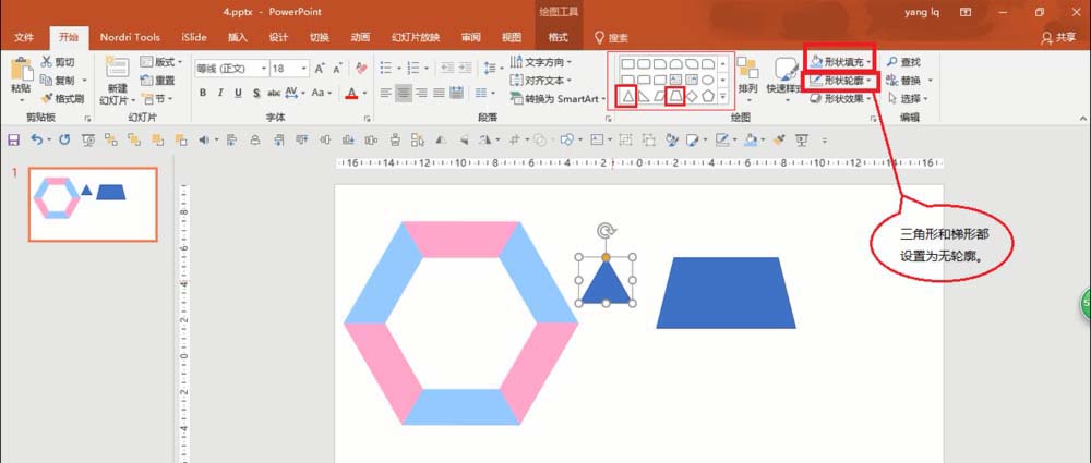 1、这个正六边形是由6个等腰梯形组成的,首先,在开始形状工具中插入一个梯形和一个等腰三角形,同时,三角形和梯形设为无轮廓(形状轮廓—无轮廓)。