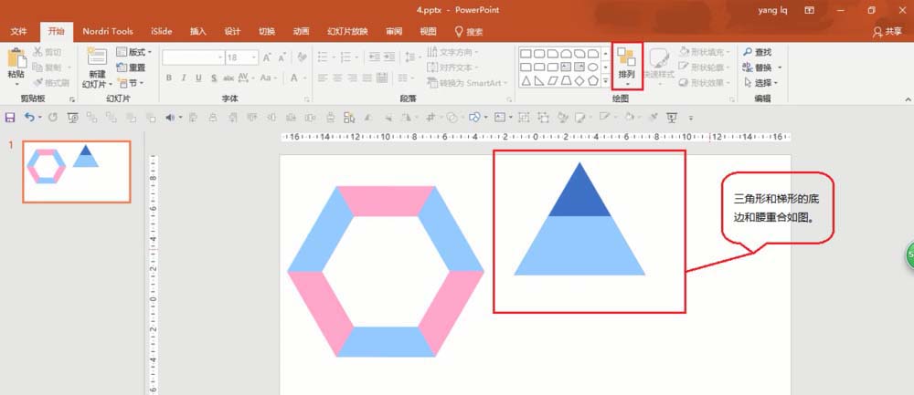 2、选中梯形,形状填充颜色换成浅蓝色,将梯形和等边三角形调整为底边相同,且梯形和等边三角形底部对齐(开始—排列—对齐方式—选择底部对齐),梯形和三角形调整为如图所示: