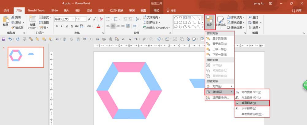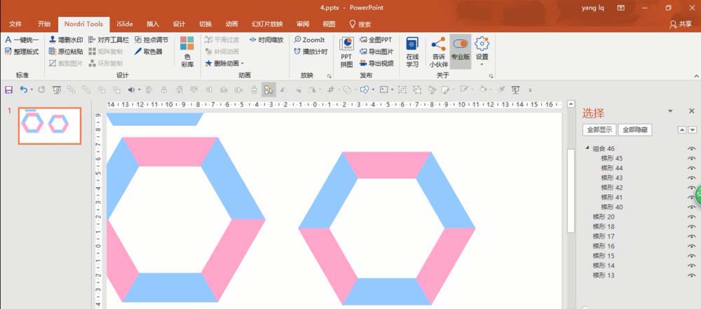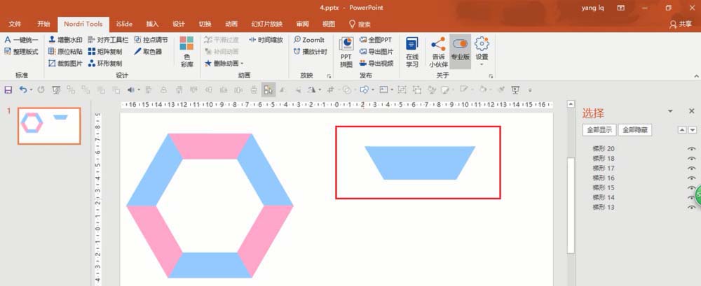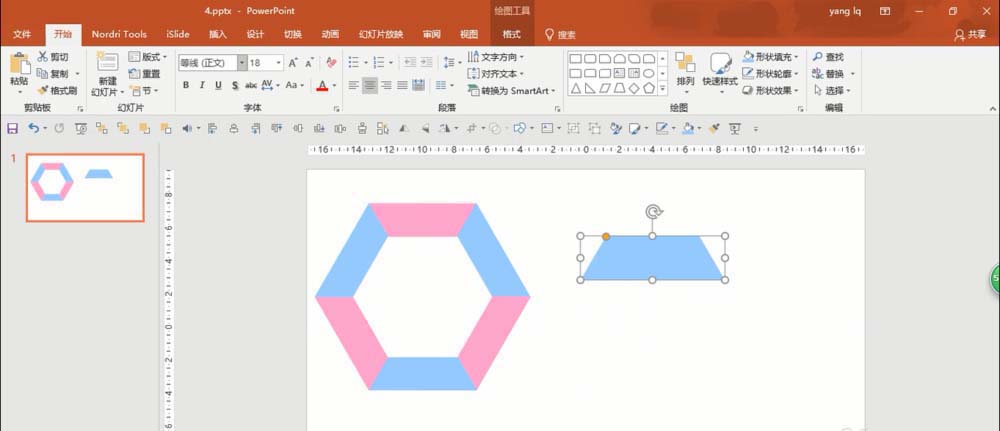 5、完成第四步后,删除中间的梯形,得到一个正六边形,根据个人喜好分别给梯形填充颜色(形状填充),选择六边形的所有梯形组合(菜单栏---格式---组合),如下图所示:
