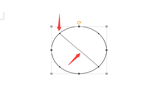 4、使用【形状】工具中的【直线】,选择之后,将十字光标移到之前的圆形外边框上,这时,边框上会出现8个链接点,如下图,我们选择其中斜线的两个连成直线。