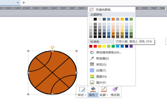 7、最后,设置篮球的外边框线型为2.5,充填色为【巧克力黄】,如下图,这样一个篮球就画好了。
